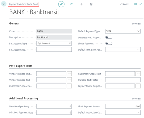 | Default Payment Type Code | Defines with which payment type an entry is to be paid, which was entered with the corresponding payment form code. By lookup you can define one of the available payment types for each payment method code. For details on the payment types, please refer to the Payment types chapter. |