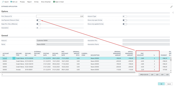 If you change the payment discount amount or the Pmt. Discount % field manually, this is also understood as a 'set application' and the entry is marked for application.