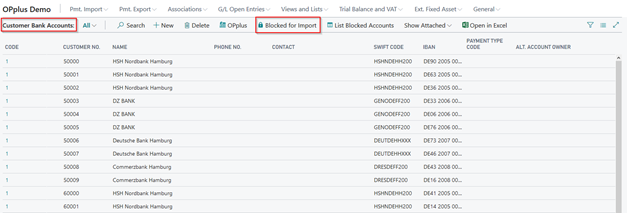 When running the Generate OPplus Setup Entries function the first time, your own bank accounts will be automatically blocked for the import. To see your own blocked bank accounts, they will be listed in the beginning of the Ext. Customer Bank Account List window.