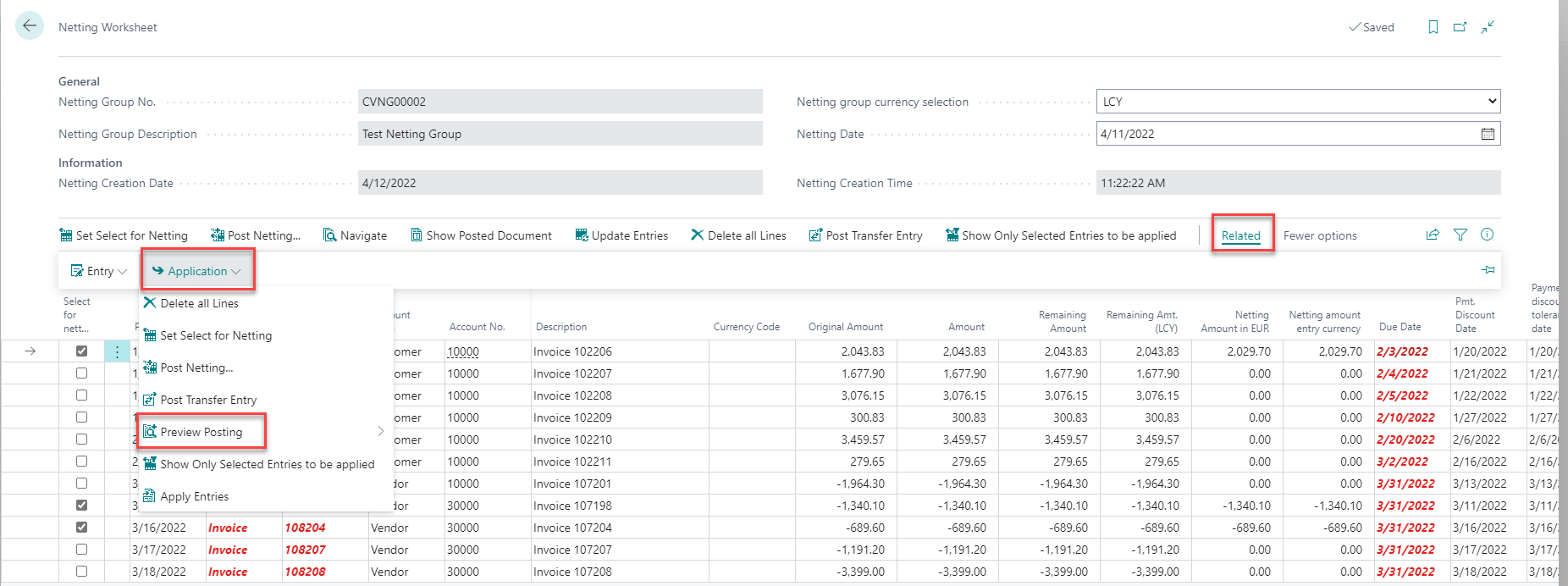 In the Selected for netting column, select the entries to be netted, or select the rows and use the Set Select for Netting action. Please make sure that the Balance for netting must have the value 0.00.
