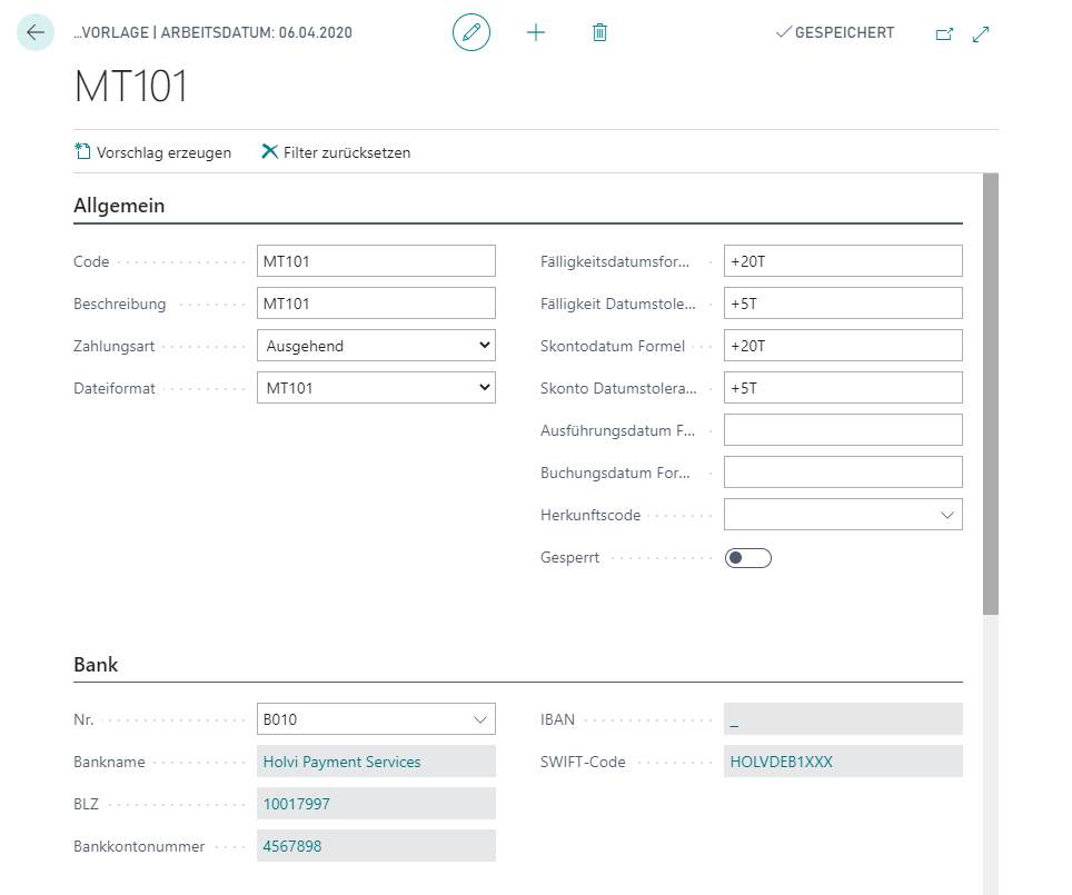 In the application, open the Payment Templates overview and create a new payment template using the +New action. Assign a unique Code.
